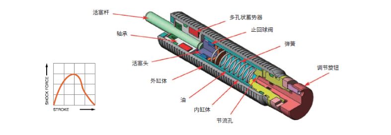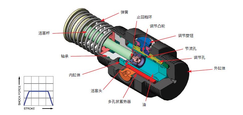 上圖是可調單節流孔緩沖器的內部結構,當力作用于活塞桿時,止回球閥歸位,閥門閉合,油被迫通過節流孔,被擠壓出受壓力的緩沖內缸,平穩流出,以控制移動負荷,使之減速。當負荷解除時,受壓彈簧反彈復位到活塞頭位置,止回球離開原位,閥門打開,使得活塞桿迅速伸張回位。在壓縮和伸張過程中,多孔狀蓄勢器代替活塞桿施力時所損失的流體,沒有蓄勢器代替流體,閉合系統將被液壓鎖定,這是由于這類節流孔的設計產生的結果。